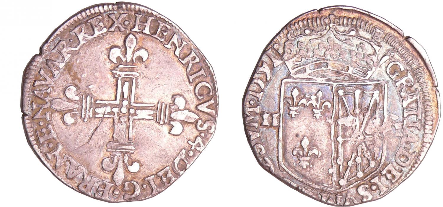 Moneda de Enrique III de Nabarra y IV de Francia, acuñada en Donapaleu-Saint Palais, ya con la corona cerrada de los Bourbones